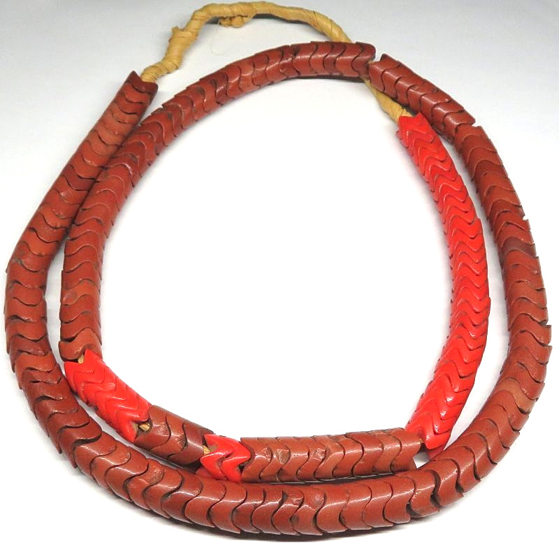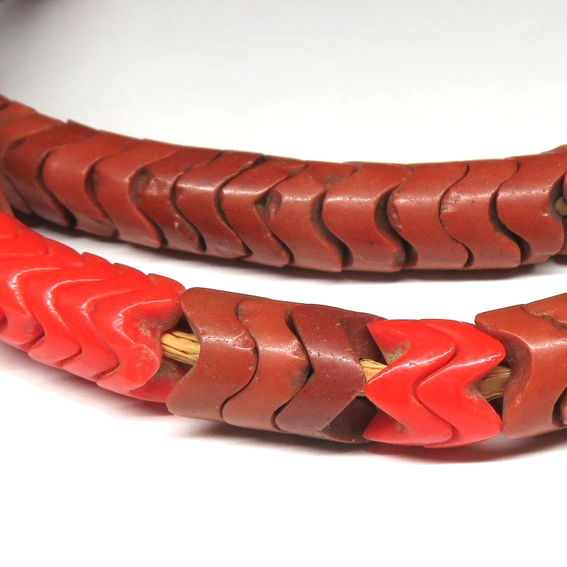 | 説明 | ボヘミア製アフリカ渡り。 太めのスネークビーズです。茶色と朱色。 茶色の方が丸みがあり、朱色の方が鋭い感じです。 ビーズがうまくジョイントして一本の蛇の脊椎のように見えます。 |