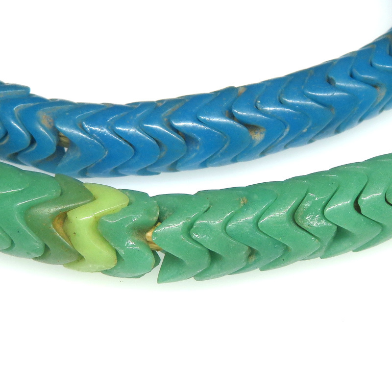 | 説明 | ボヘミア製アフリカ渡り。 太めのスネークビーズです。ブルーとグリーン。 ビーズがうまくジョイントして一本の蛇の脊椎のように見えます。 |
