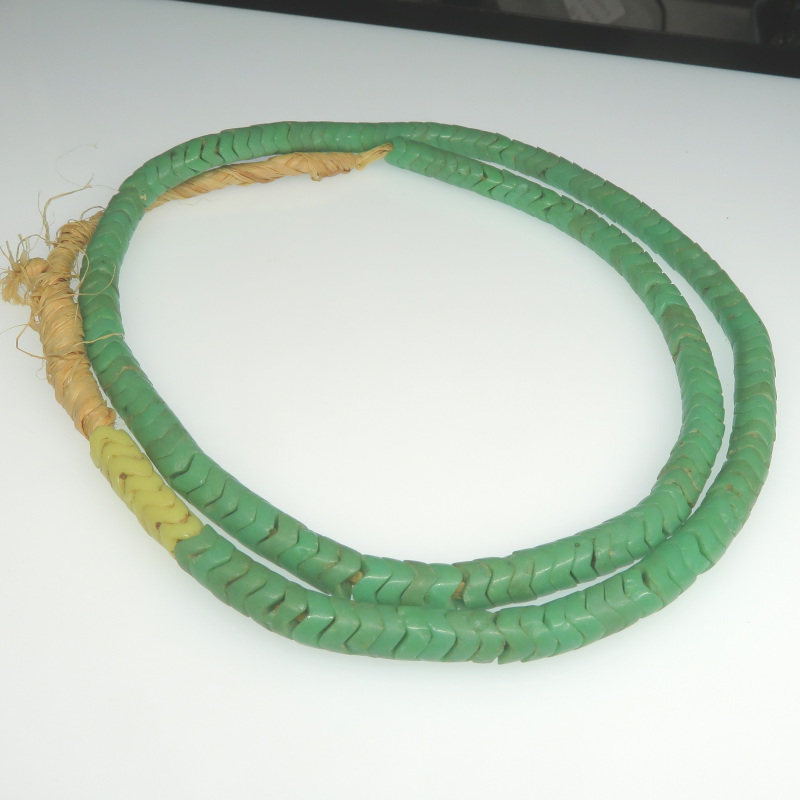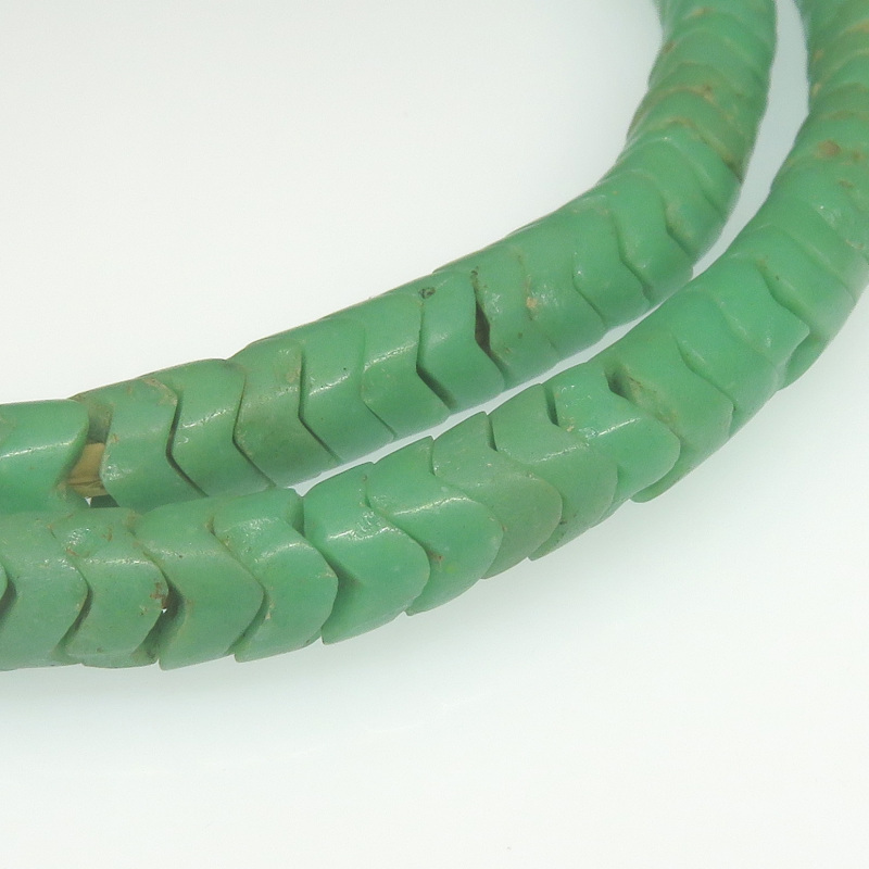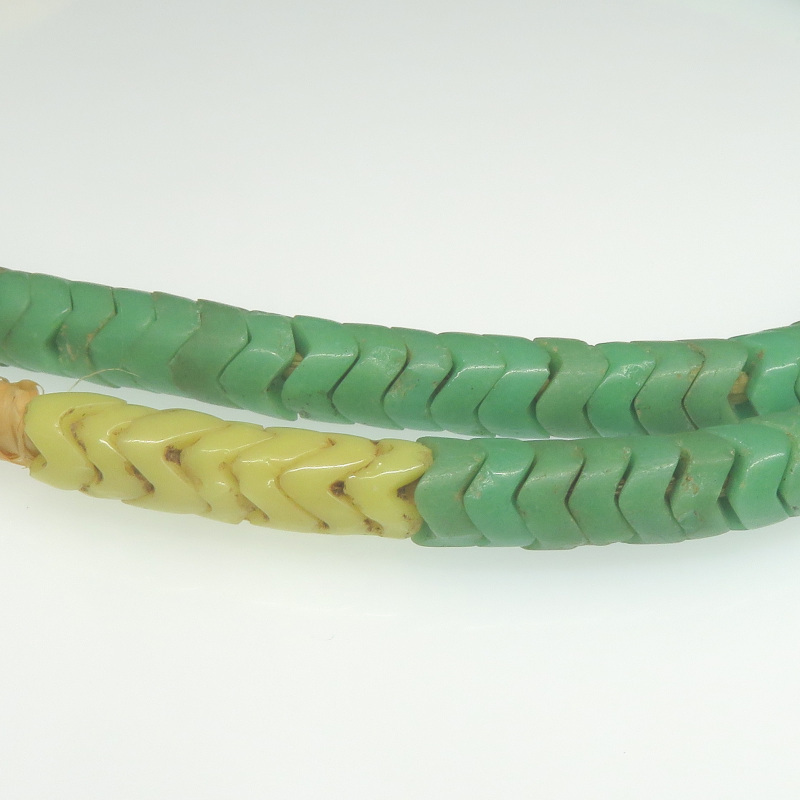 | 説明 | ボヘミア製アフリカ渡り。 スネークビーズです。 色はやさしい色調のグリーンです。淡い黄色も少し混じっています。 角が滑らかで背の低いタイプ。 ビーズがうまくジョイントして一本の蛇の脊椎のように見えます。 |