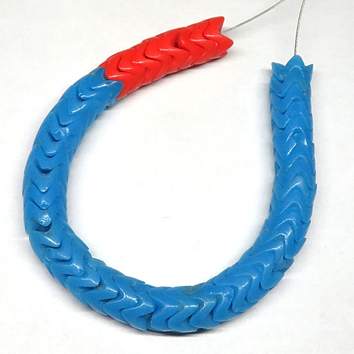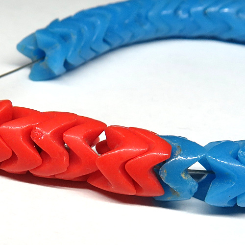 | 説明 | ボヘミア製アフリカ渡り。 太めのスネークビーズです。 朱色とブルーのミックス短連。 ビーズがうまくジョイントして一本の蛇の脊椎のように見えます。 |