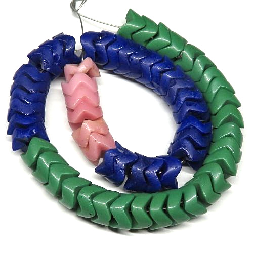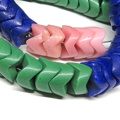 | 説明 | ボヘミア製アフリカ渡り。 太めのスネークビーズです。 グリーンとネイビーとピンクのミックス短連。 ビーズがうまくジョイントして一本の蛇の脊椎のように見えます。 (この連は少違う形のものも交じっているので、すべてがきれいにはジョイントしません。) |