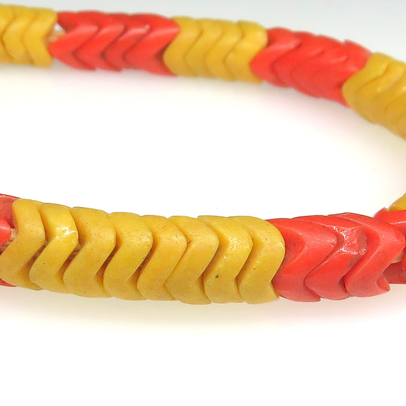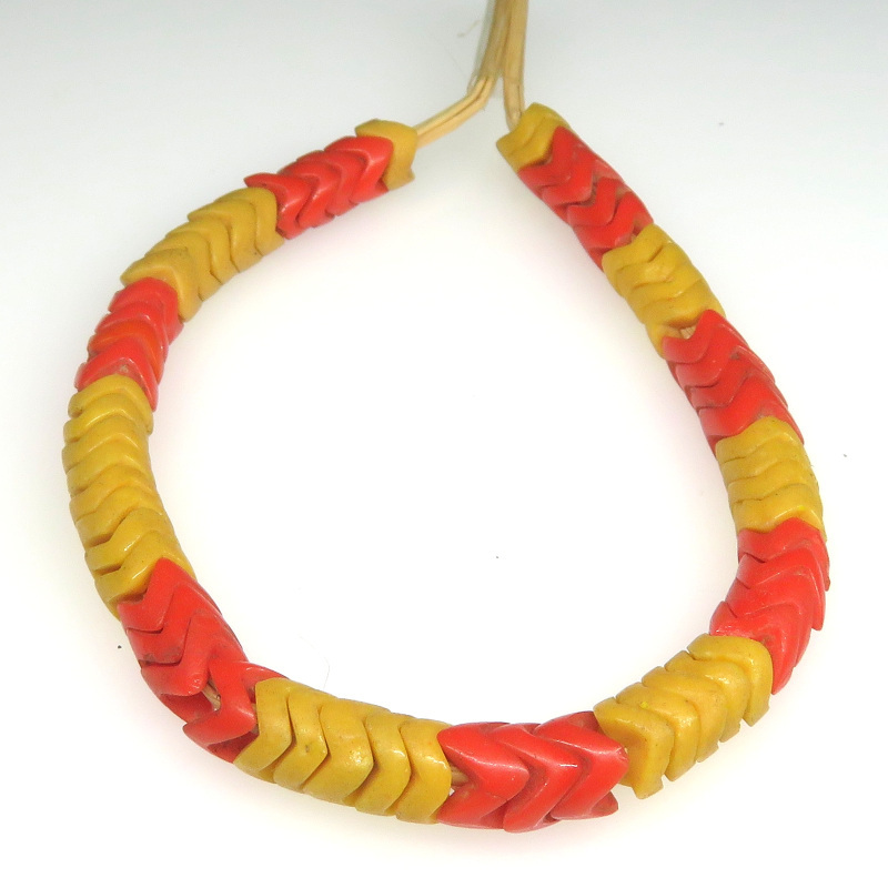 | 説明 | ボヘミア製アフリカ渡り。 スネークビーズです。山吹色と朱色のミックス短連。 平たいタイプと通常のタイプのミックスです。 ビーズがうまくジョイントして一本の蛇の脊椎のように見えます。 |