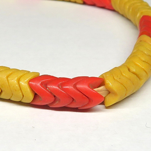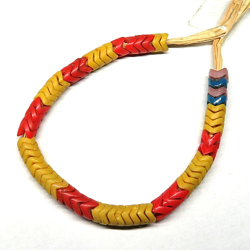 | 説明 | ボヘミア製アフリカ渡り。 スネークビーズです。 山吹色と朱色+αのミックス短連。 平たいタイプと通常のタイプのミックスです。 ビーズがうまくジョイントして一本の蛇の脊椎のように見えます。 |