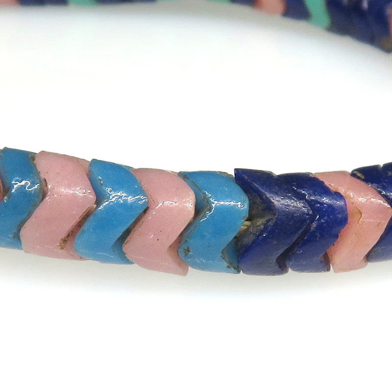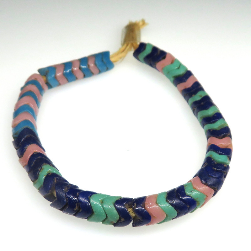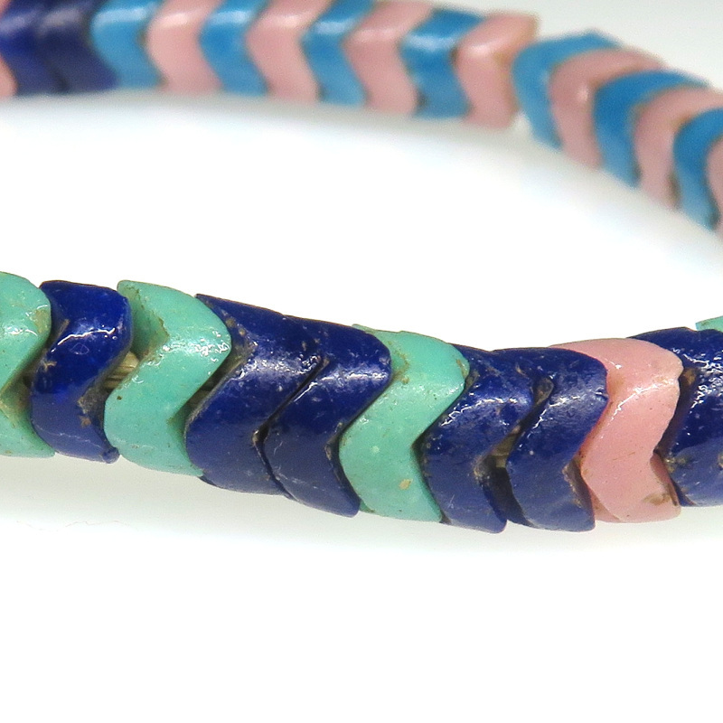 | 説明 | ボヘミア製アフリカ渡り。 スネークビーズです。 ピンクとグリーン、紺、ブルーのミックス短連。 平たいタイプです。 ビーズがうまくジョイントして一本の蛇の脊椎のように見えます。 |