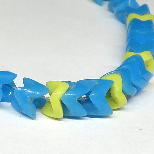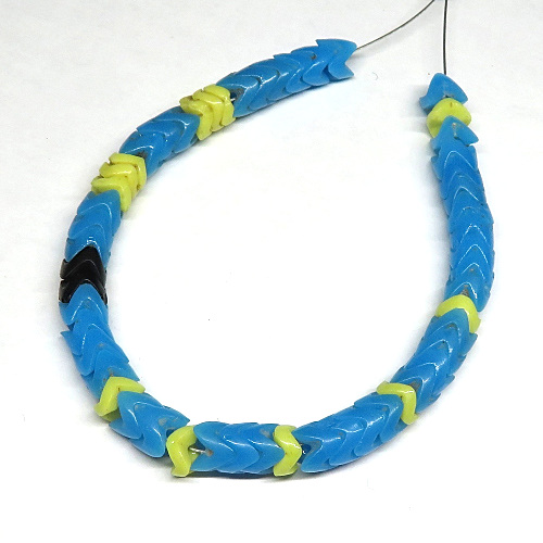 | 説明 | ボヘミア製アフリカ渡り。 スネークビーズです。 ブルーときいろ、黒のミックス短連。 平たいタイプと通常のタイプのミックスです。 ビーズがうまくジョイントして一本の蛇の脊椎のように見えます。 |