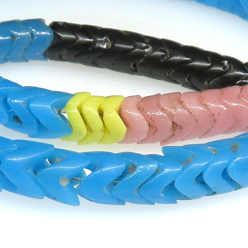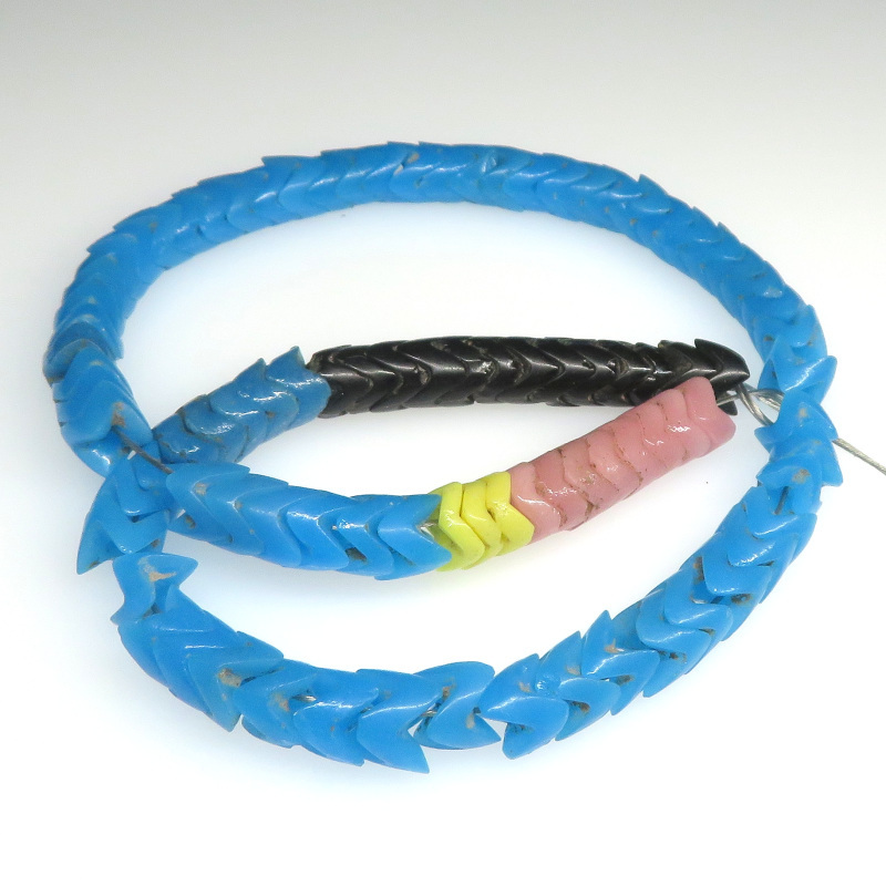 | 説明 | ボヘミア製アフリカ渡り。 スネークビーズです。 ブルーとピンク、黄色、黒のミックス短連。 平たいタイプと通常のタイプのミックスです。 ビーズがうまくジョイントして一本の蛇の脊椎のように見えます。 |