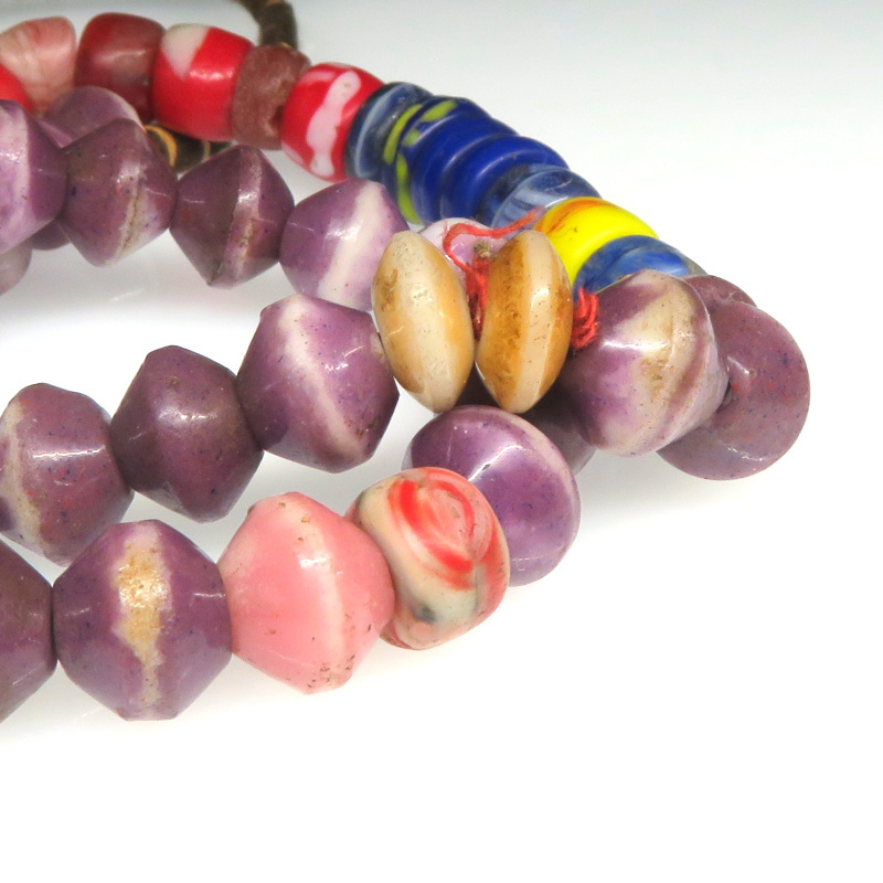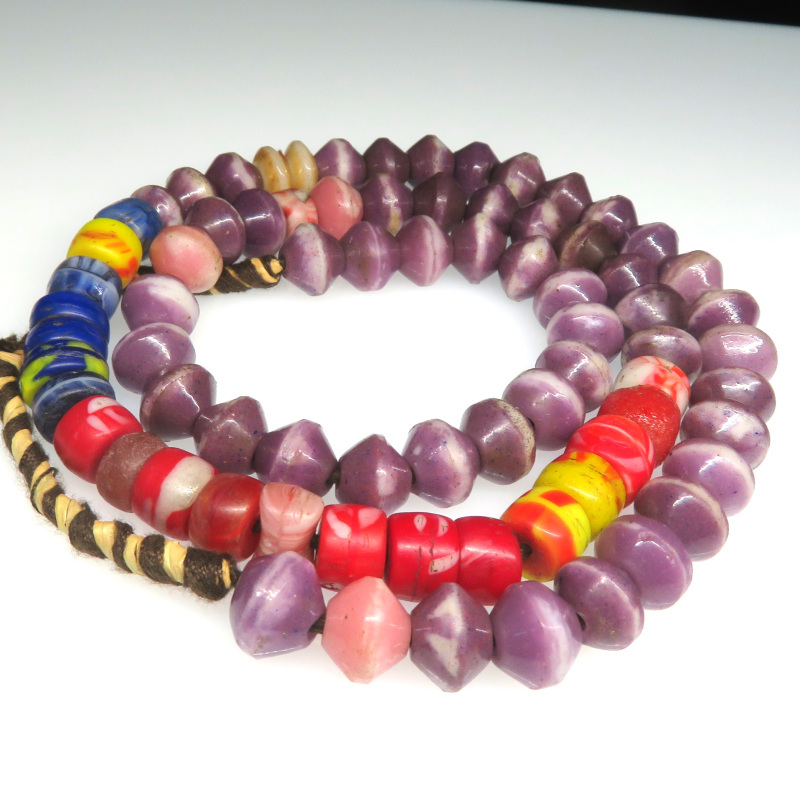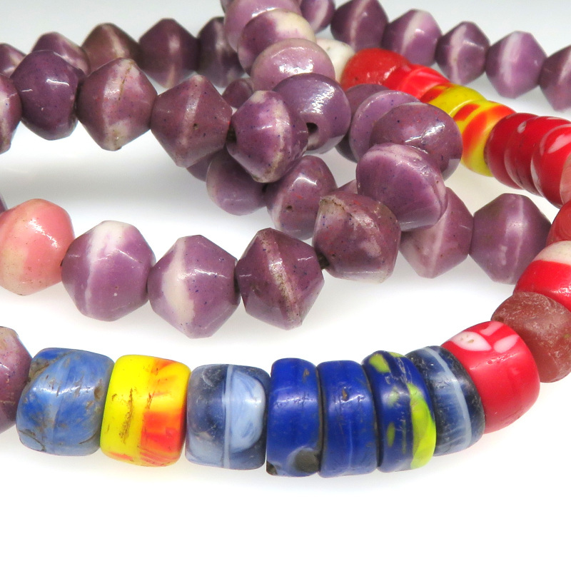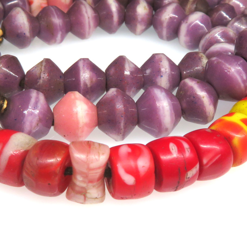 | 説明 | ボヘミア製アフリカ渡り。 西アフリカでカカンバと呼ばれ、人々に親しまれているビーズと珍しいそろばん玉のMix連です。 一つ、珍しい形のものがあります。一個一個見ていて楽しい連です。 いろんな大きさ・形のものが混じっています。 |