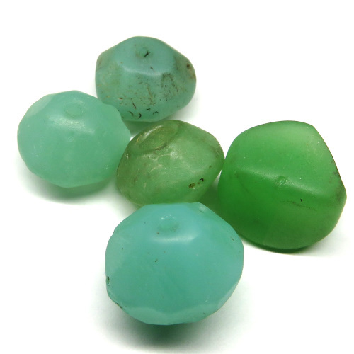 | 説明 | ボヘミア製アフリカ渡り。 ウランガラスビーズです。 乳白緑が5個。うち一つは、珍しい形をしています。 |
