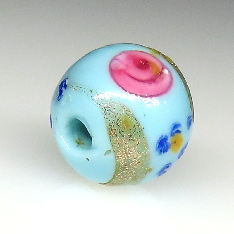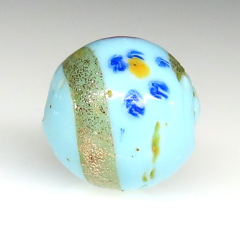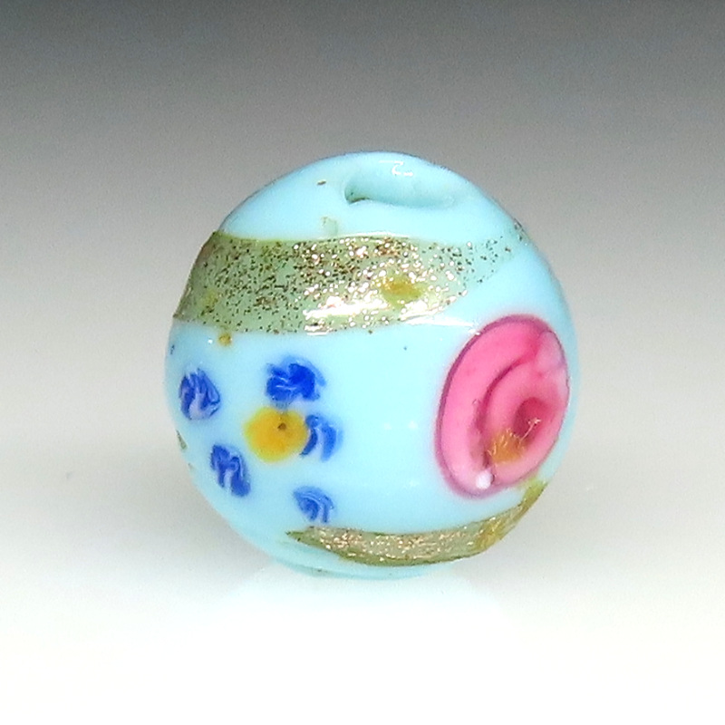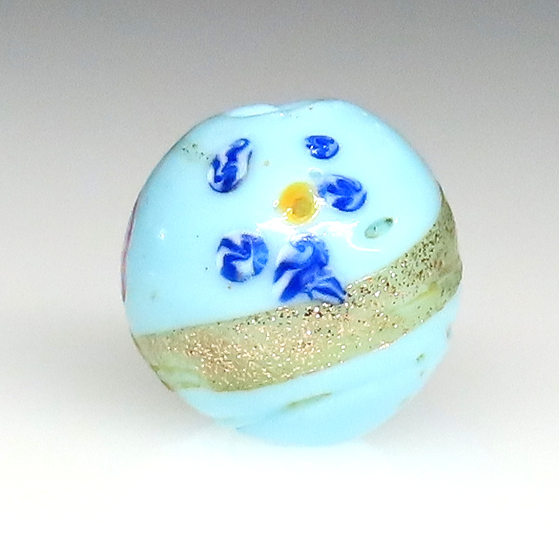 | 説明 | ヴェネチア製。 やさしい色合いのミルキーブルーに薔薇と忘れな草のモチーフそして豪華な金帯(アヴェンチュリン)の愛らしい玉。 モチーフは、忘れな草が2つ、薔薇が1つです。 |
