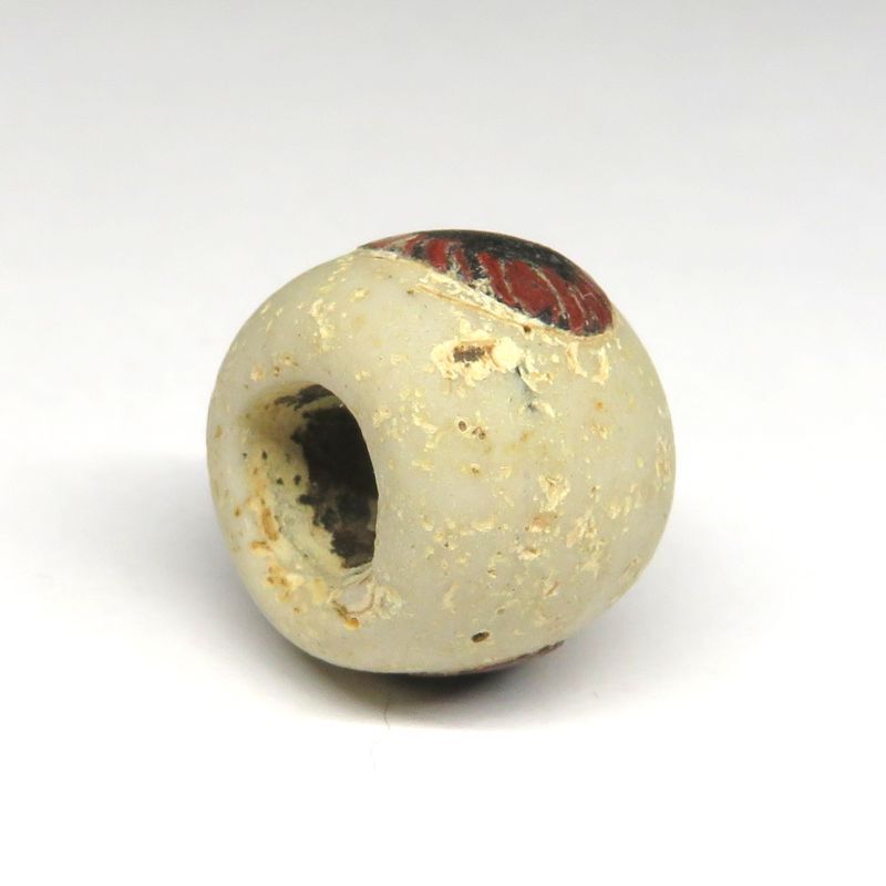 | 説明 | イスラム期のガラスビーズ。 モザイク貼付玉です。 乳白のボディーに大きな二つの目玉を持ったアイビーズ。 |