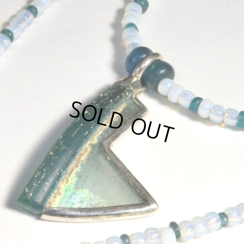 | 説明 | ローマングラス銀化トップのネックレスです。 トップの銀化ローマンは器の縁部分でしょう。縁が濃い緑。その下が高貴な光をたたえ、格調高い仕上がりになっています。 緑青のビーズは10世紀前後のインドパシフィックビーズ。 清潔感のある乳白のビーズは1900年代初頭のヴェネチアンビーズ。 根元のビーズと留め具は、純度の高いカレンシルバーです。 装飾品としてはもちろん、古代美術品のコレクションとしてもお勧めです。 |