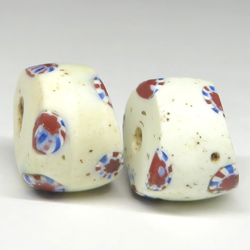 | 説明 | ヴェネチア製アフリカ渡り。 樽型のミルフィオリです。 似たようなデザインのものを2個セットにしました。 上下が少し斜めにカットされたタイプです。 |
