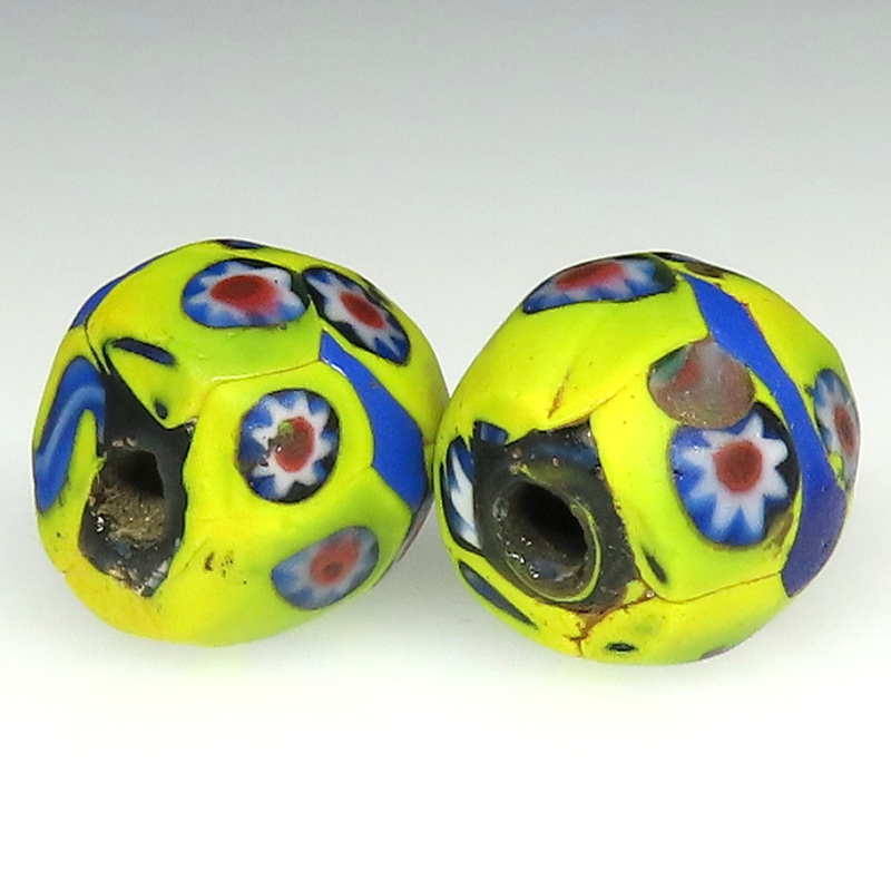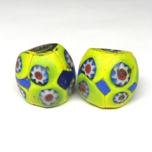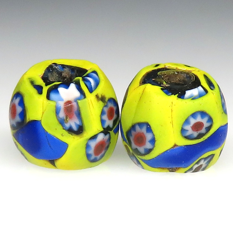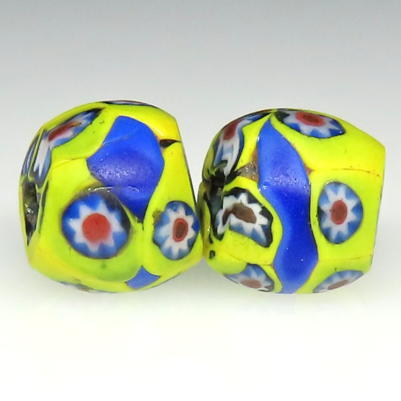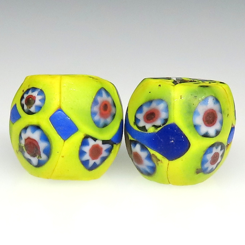 | 説明 | ヴェネチア製アフリカ渡り。 樽型のミルフィオリです。 似たような大きさ・形のものを2個セットにしました。 上下を少し斜めにカットしたタイプです。 |