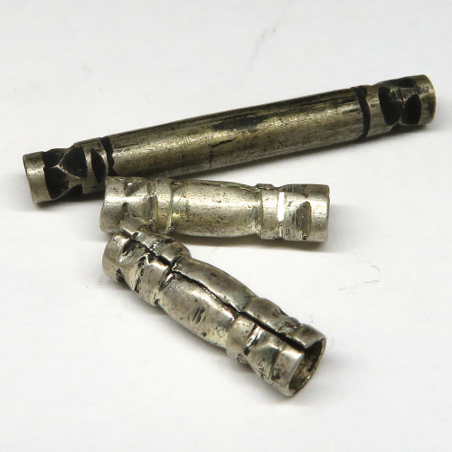| 説明 | 1900年代初め頃。 サハラ砂漠の遊牧民トゥアレグ族のシルバービーズです。 シルバー合金だと思います。 手作りで、雰囲気があります。 小さいもの2個と長いもの一個の3個セットです。 |