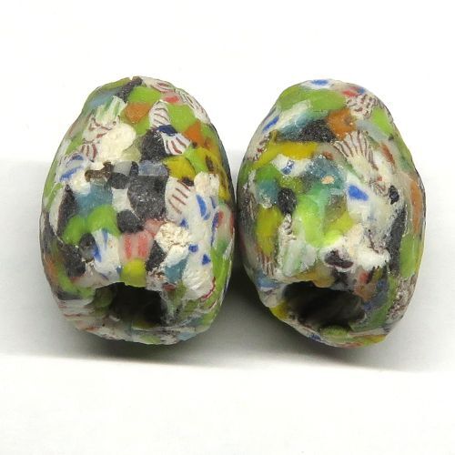 | 説明 | ガーナ製。 再生ガラスです。 1800年代後期〜1900年代初期のヴェネツィアンビーズを砕いて、再生したものです。 混沌とした色の洪水の中に、独特の世界観が表出してくるようです。 素材の関係で形が、でこぼこした部分もございます。 いろんな色の筋玉が隠れていて、見ていて飽きが来ません。 2個セットです。 |