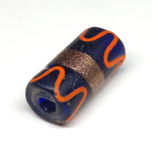 | 説明 | ヴェネチア製アフリカ渡り。 華やかなウェディングケーキ。 希少な瑠璃色クリアのボディーに、アベンチュリン(金彩)の帯、そしてオレンジ色のラインが鮮やかで、美しいです。 この手の玉は、どうしてもモチーフの欠損が見られるのですが、これは大変状態が良いです。 ツヤのないマットな肌をしています。 |