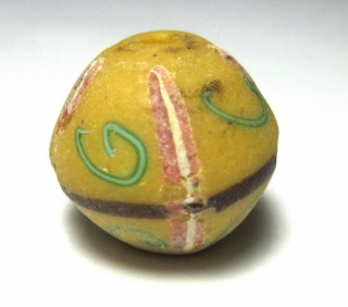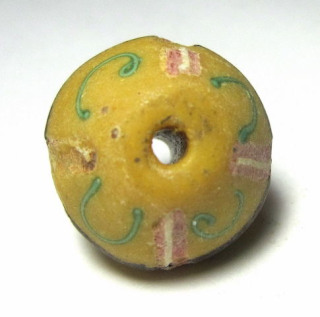 | 説明 | ヴェネチア製アフリカ渡り。 キングビーズの愛称で呼ばれています。 王者の風格あふれた貴重な大型ビーズ。 中央の茶帯が印象的な珍しいキングビーズです。 枡の中に丸ではなく、凹の字のようなものが描かれているのがおもしろい。このラインは、グリーンと白の2色使いです。 |