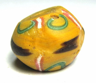| 説明 | ヴェネチア製アフリカ渡り。 キングビーズの愛称で呼ばれています。 王者の風格あふれた貴重な大型ビーズ。 中央の茶帯が印象的な珍しいキングビーズです。 枡の中に丸ではなく、凹の字のようなものが描かれているのがおもしろい。このラインは、グリーンと白の2色使いです。 |