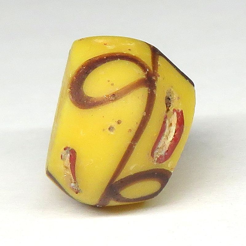 茶色のラインが大胆にくねり、目をデフォルメしたような文様が添えられています。 熟練の職人による大胆なデザイン。 キングビーズと同様の形のものの両端をカットしたタイプです。 |