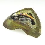容器のどの部分でしょうか。厚みがあって中央部が凹んでいるので、底の辺りかと推察します。 一つの面は比較的新しい割れで、銀化は生じておりません。 角度により、光の種類により、違った輝きを見せてくれます。