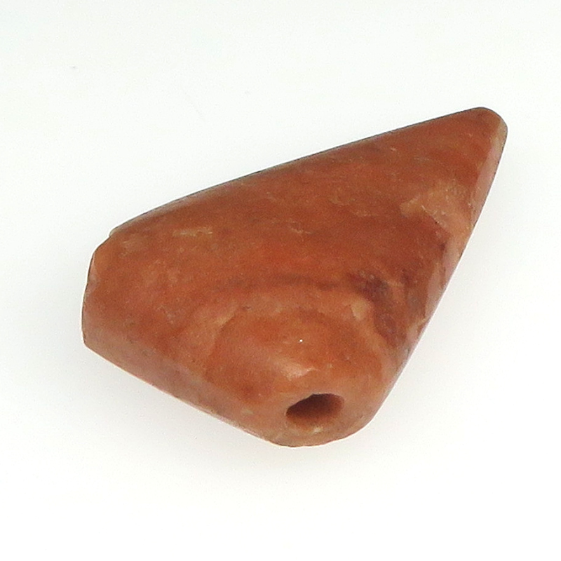 | 説明 | 西アフリカの発掘のカーネリアンです。 珍しいペンダントトップ型。 両方から穿孔する方法で穴が開けられているので、穴の入り口が広く真ん中の方が小さくなっています。 この形で、うまく穿孔したものだとため息が出ます。 左右からのトンネルが少しずれていて、まっすぐに通らない場合もあります。 このビーズの場合は、少しずれていますが、貫通しています。 |