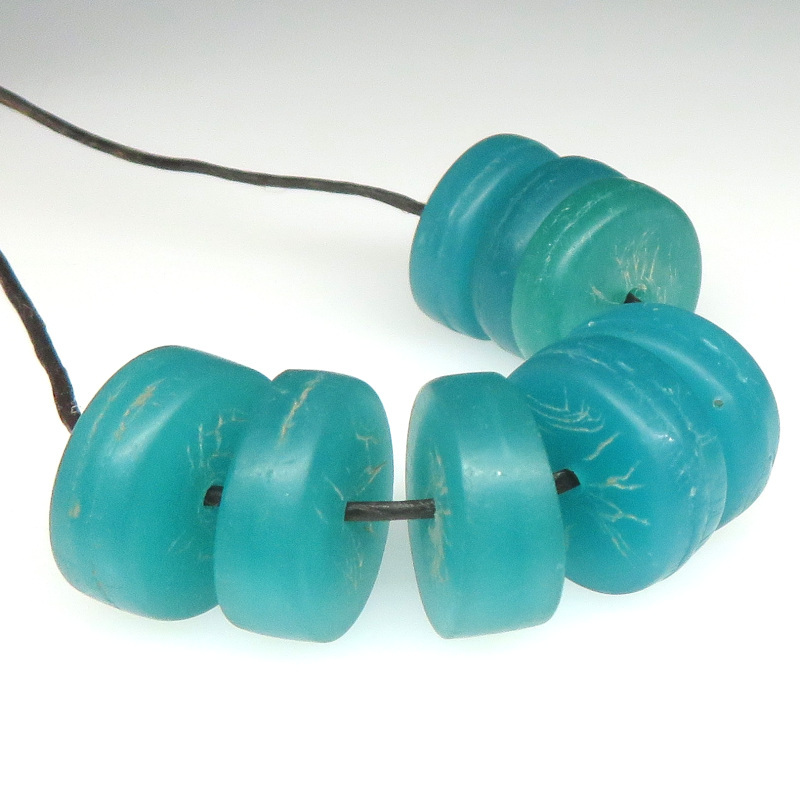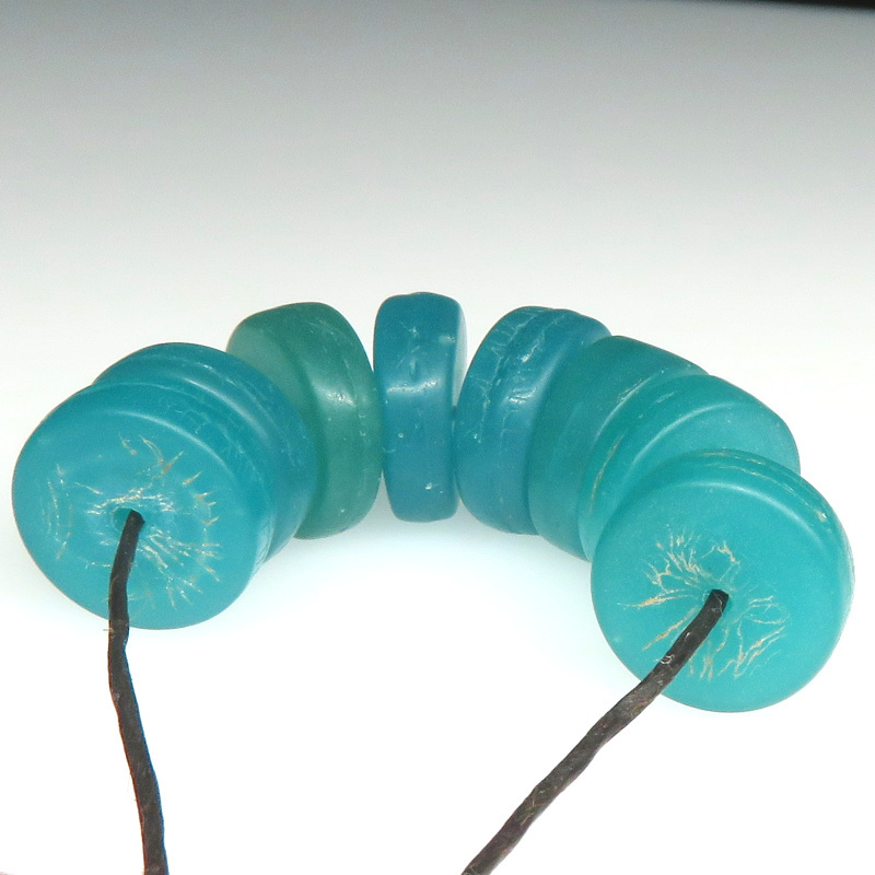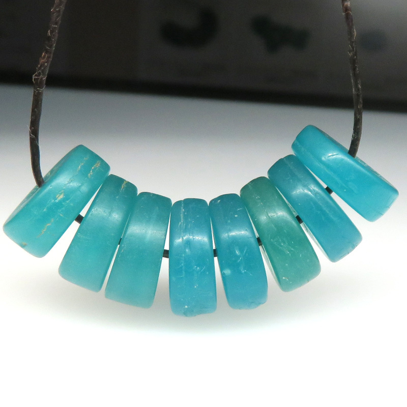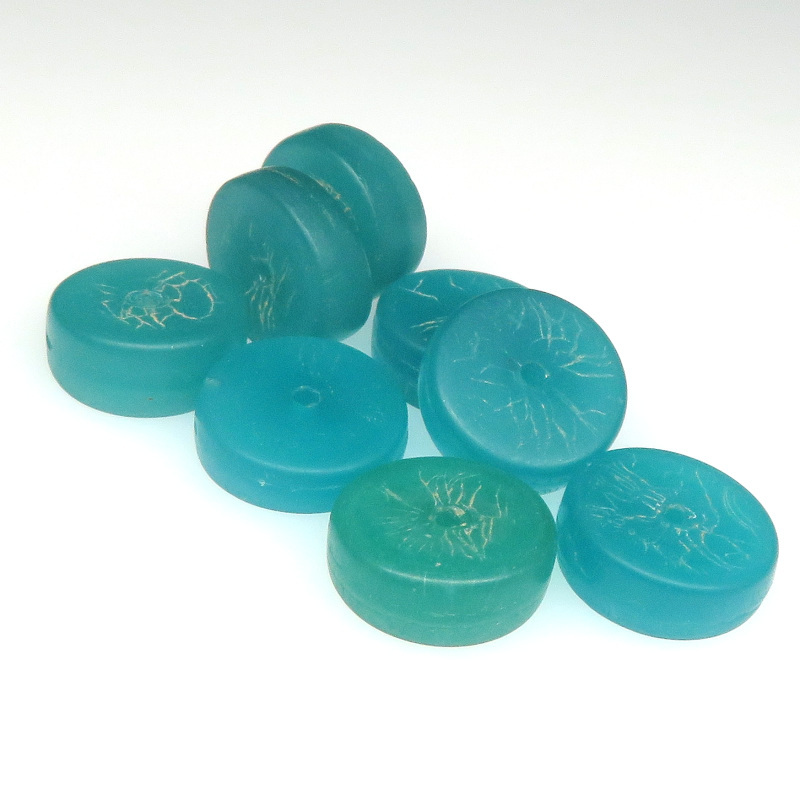 説明 | ボヘミア製。 良い色のブルーのディスク型ウランガラスビーズです。 深い湖のような青緑色です。 大8個セット。 |
