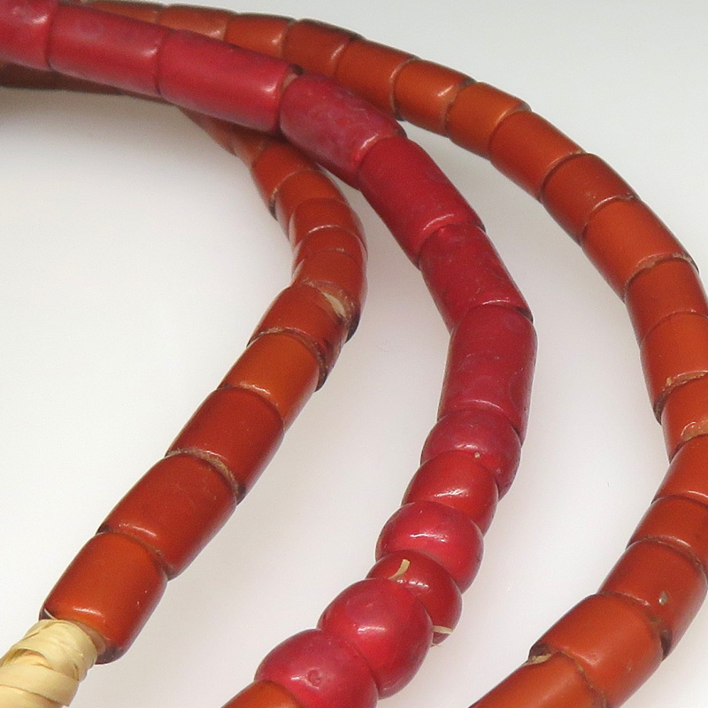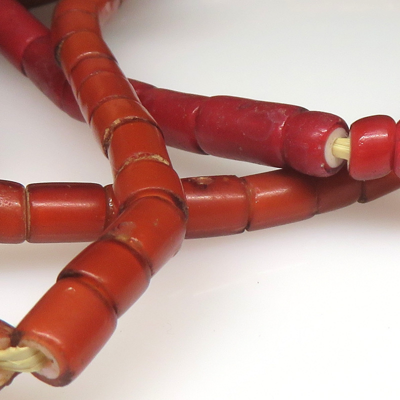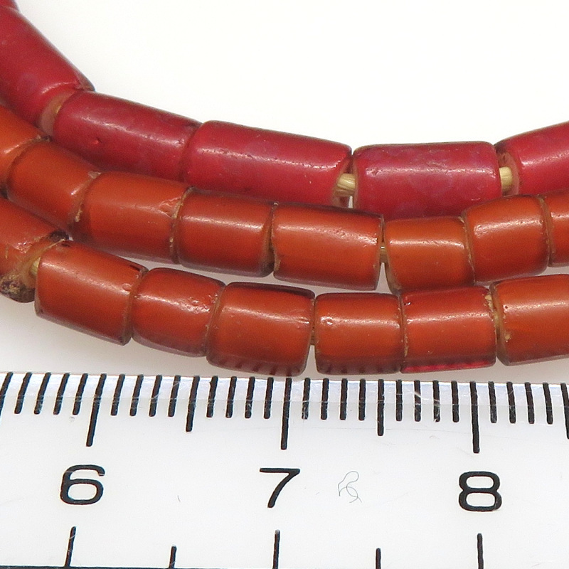 制作時に入った気泡が抜けた穴や筋、経年の擦れ、古色、小キズ、小欠けのある粒も混じっています。