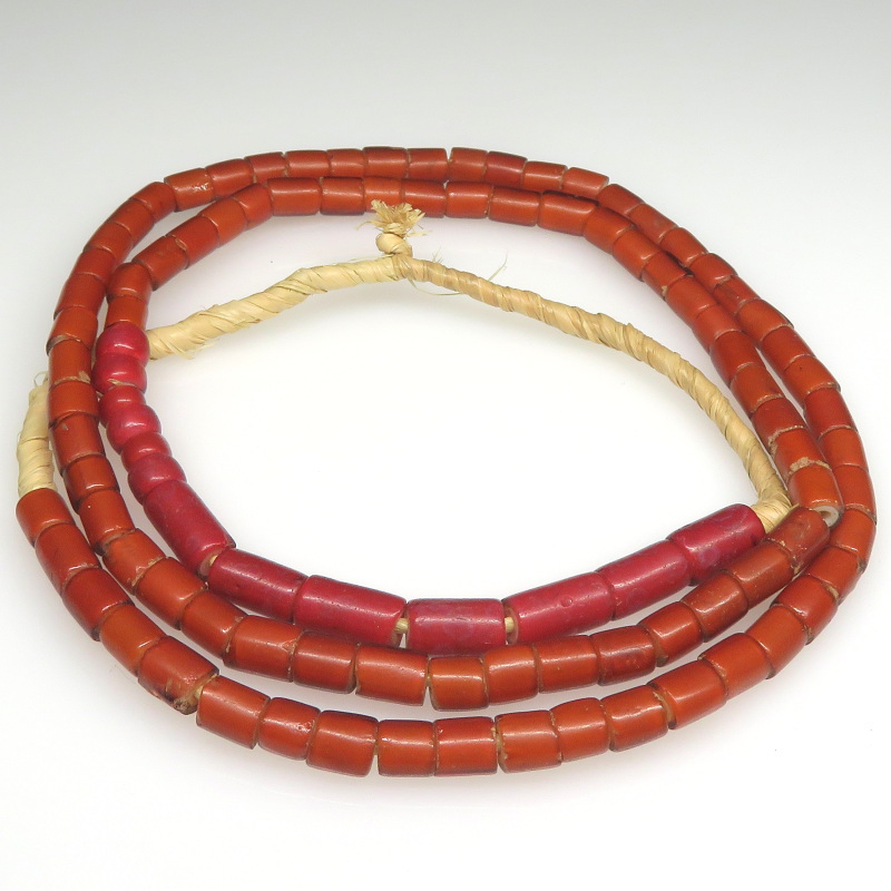風格と気品があります。 少し大きめのチューブ型2種類の色と、粒が6粒。 画像よりももう少し深い色目です。 粒は一粒一粒、色・サイズ・形に個性がありますが、比較的大きさの揃った美しい連です。