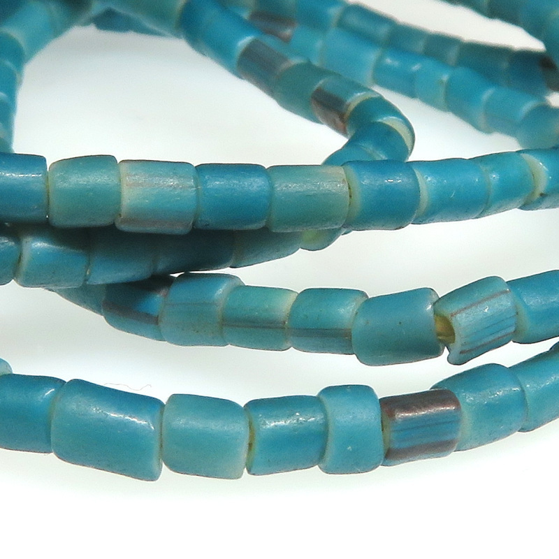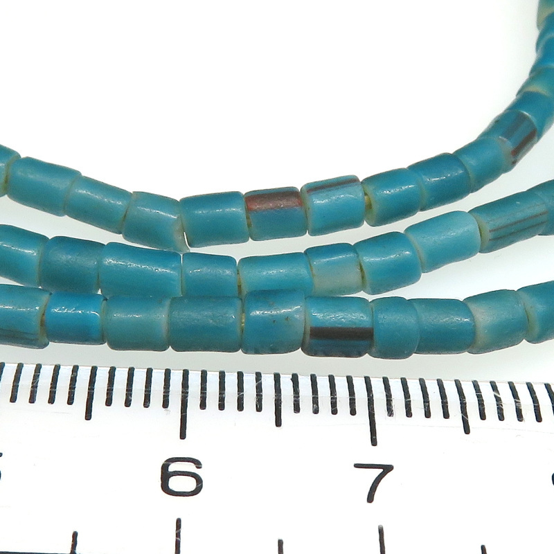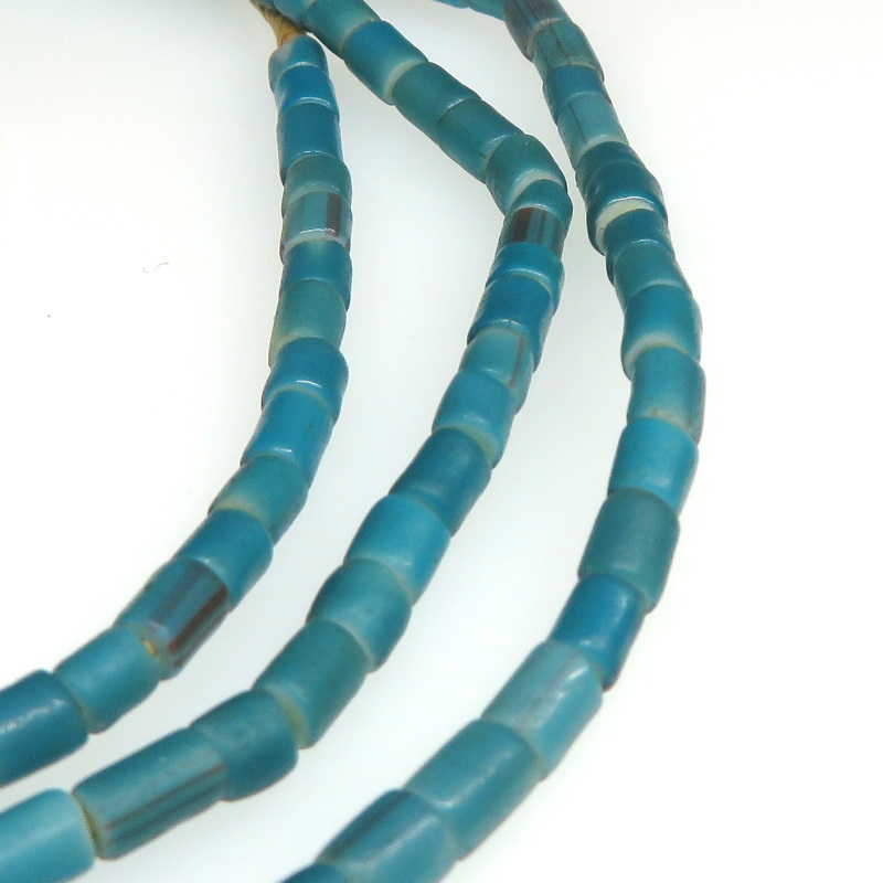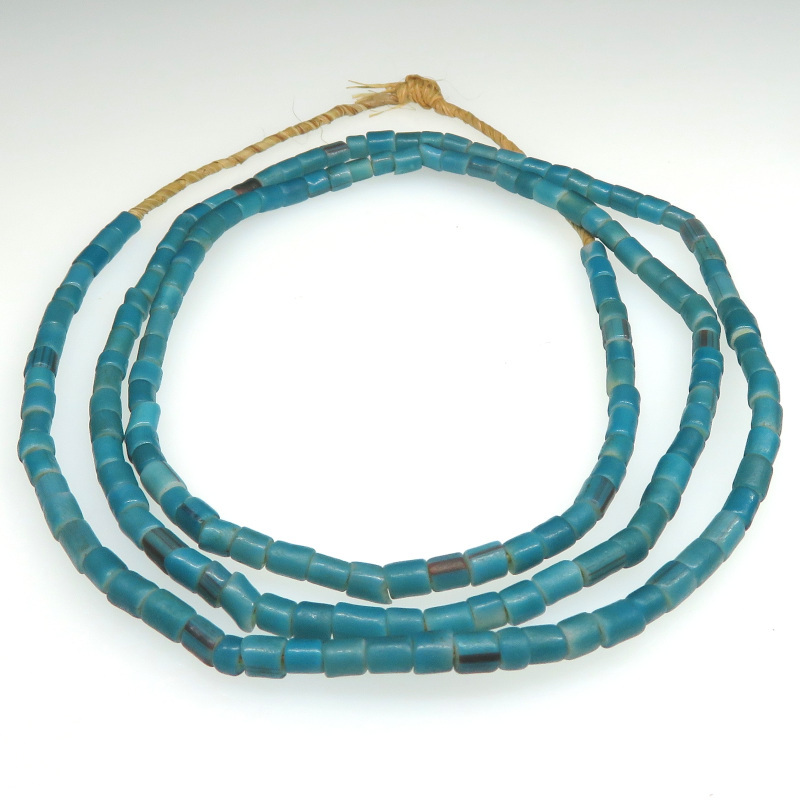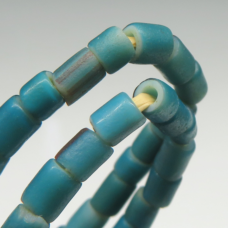 深い海の底のような渋い青に、乳白が透けて神秘的。艶のないタイプです。 青のグラデーションが魅力的です。赤茶っぽいラインの入った粒も混じっています。 粒は一粒一粒、色・サイズ・形に個性がありますが、比較的大きさの揃った連です。 |