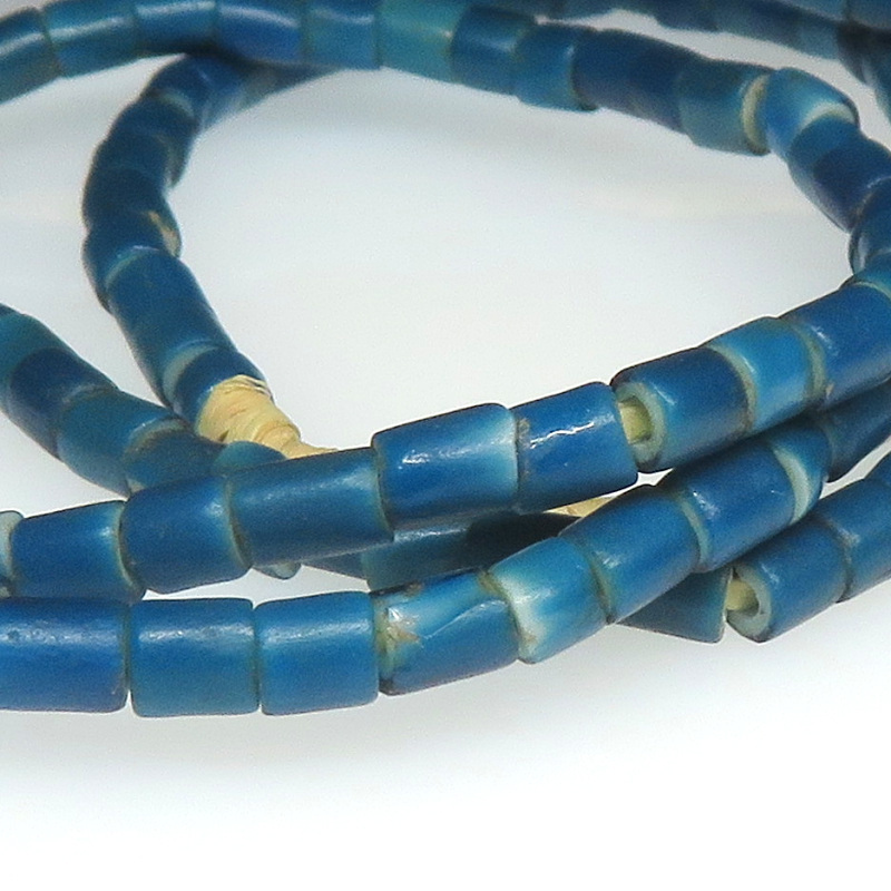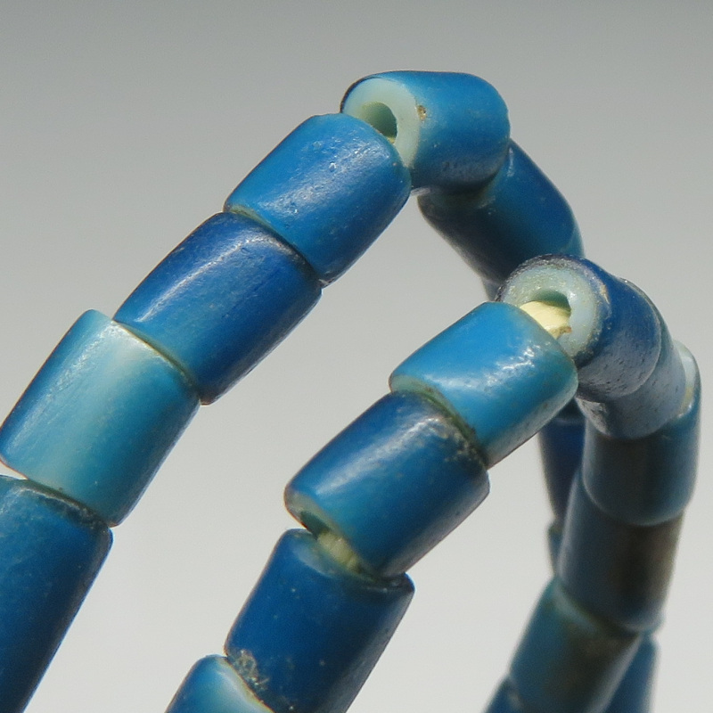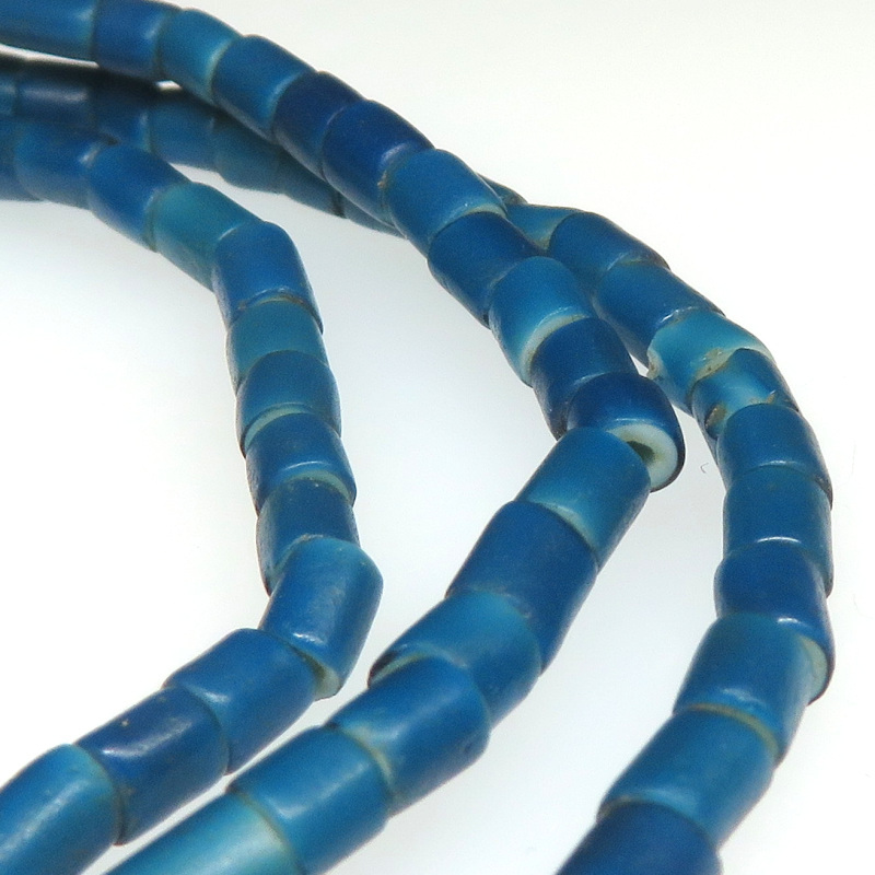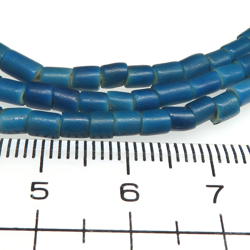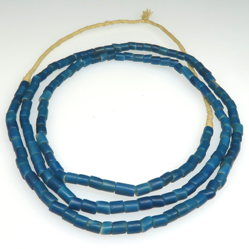 全体的に艶のない渋いタイプ。 珍しいタイプの青。深い暗い深海の色。 粒は一粒一粒、色・サイズ・形に個性がありますが、比較的大きさの揃った連です。 |