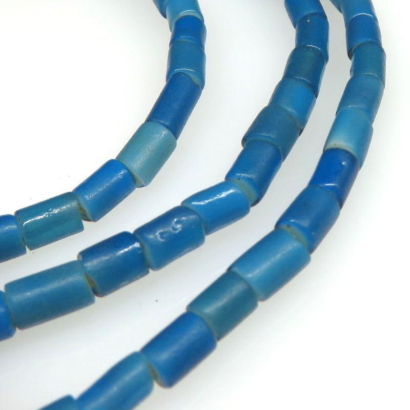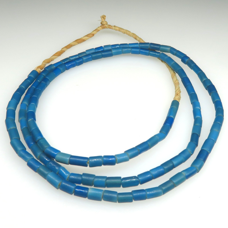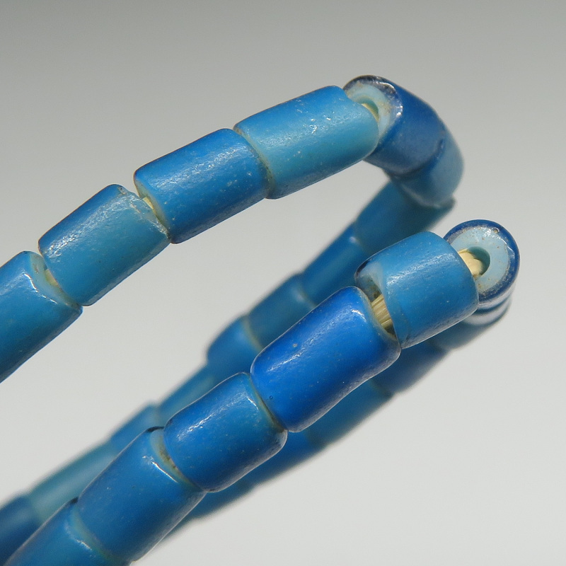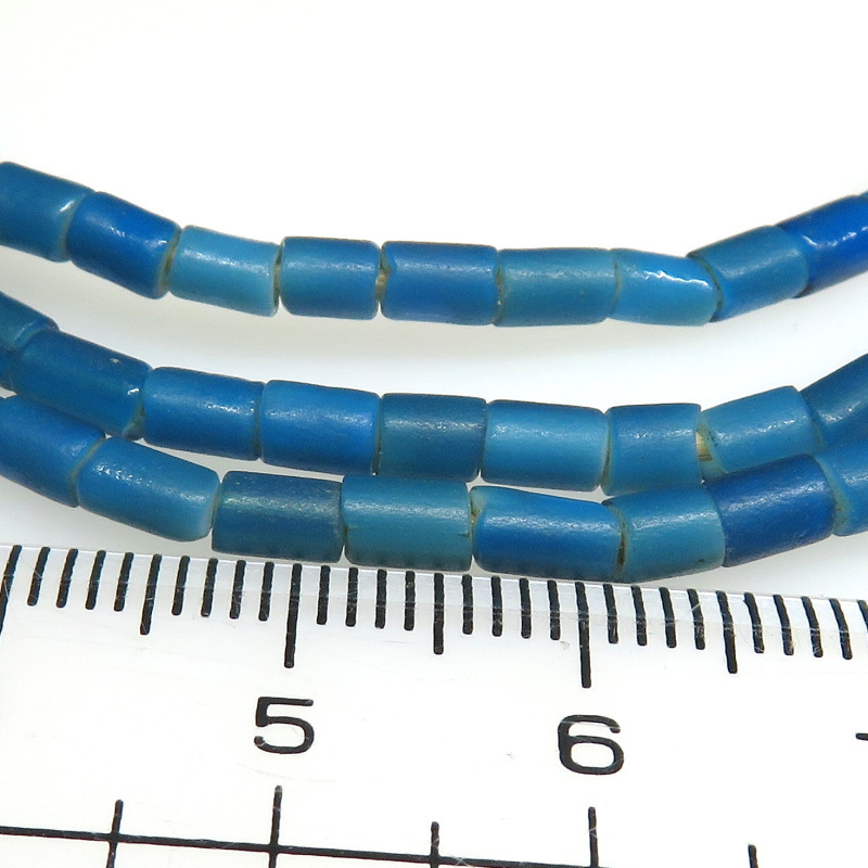 全体的に艶のない渋いタイプ。 珍しいタイプの青。深い暗い深海の色。 粒は一粒一粒、色・サイズ・形に個性がありますが、比較的大きさの揃った連です。 |