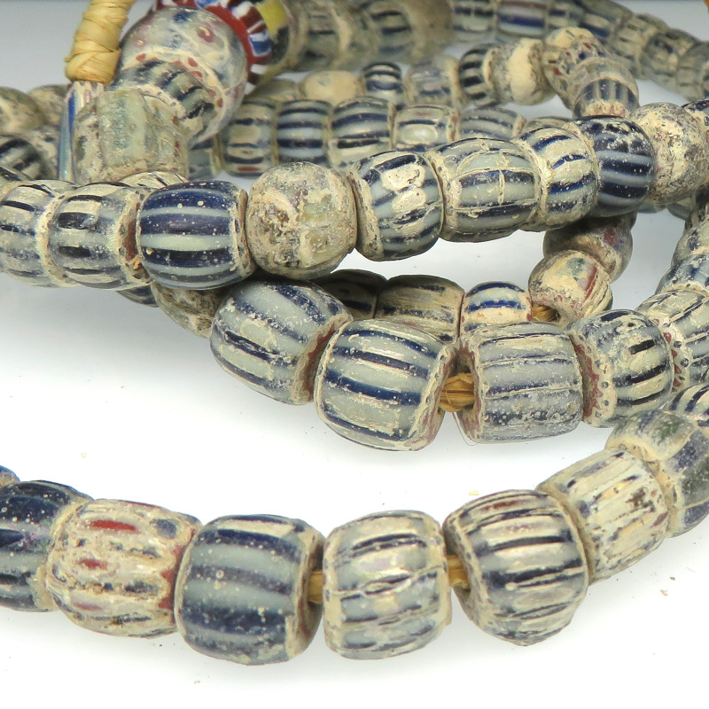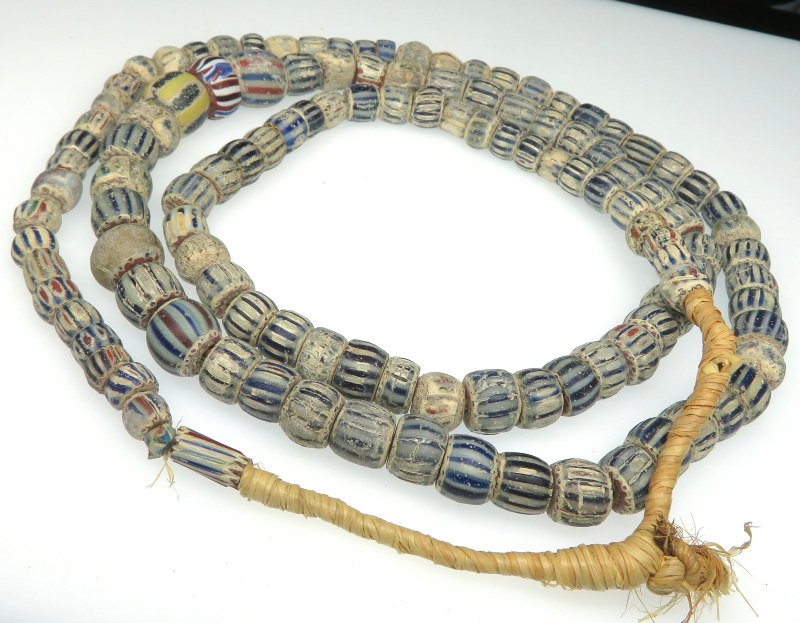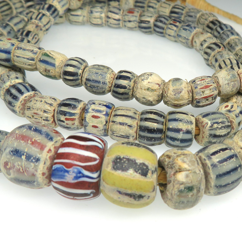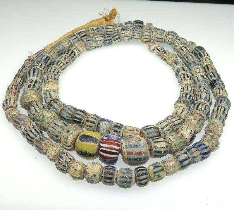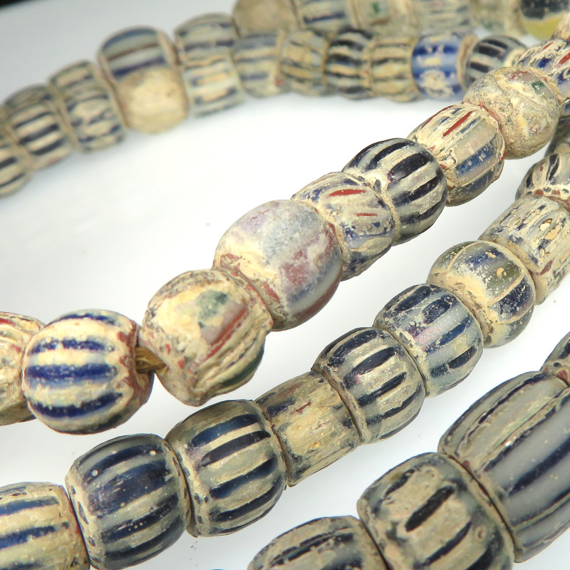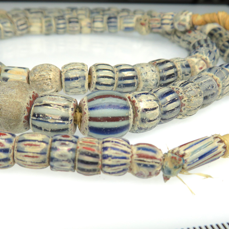 迫力のロング連です。 全体的に風化がかなりありますが、一部銀化のような輝きも放っており、なんとも神秘的。 一粒一粒がすべて違っていて、そのどれもが美しいです。 中央部になぜか1800年代後期〜1900年代初頭に作られた茶色い筋玉が一粒入っています。 その隣の黄色と黒の筋玉は、大変珍しい玉。層構造になっています。 是非この一連の形のままコレクションに加えていただきたい逸品です。 |