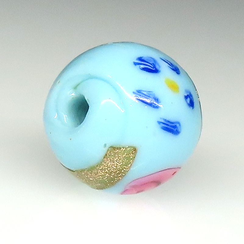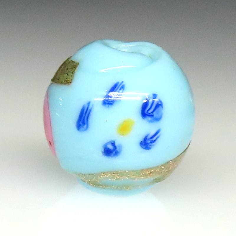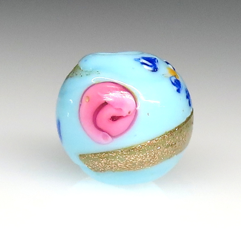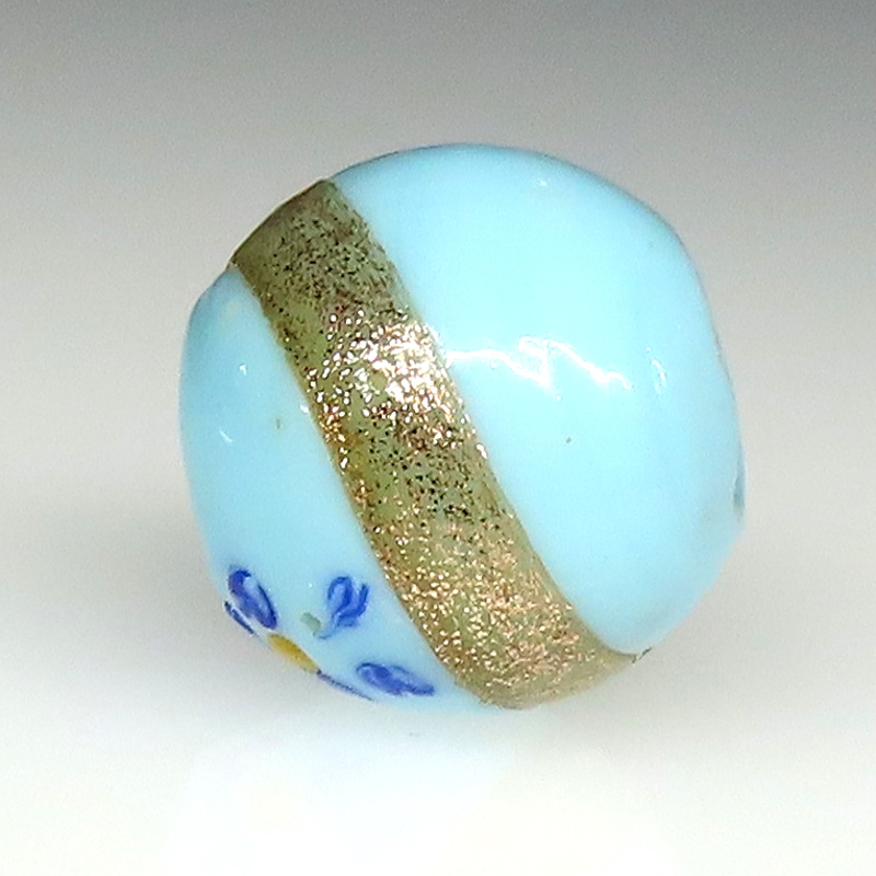 | 説明 | ヴェネチア製。 やさしい色合いのミルキーブルーに薔薇と忘れな草のモチーフそして豪華な金帯(アヴェンチュリン)の愛らしい玉。 モチーフは、忘れな草が2つ、薔薇が1つです。 |