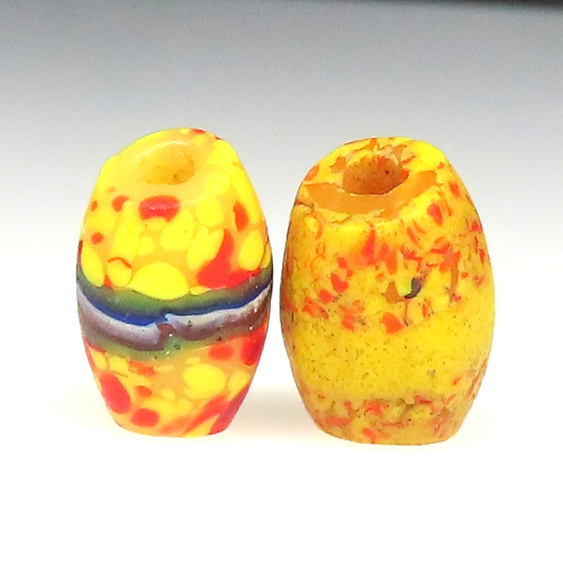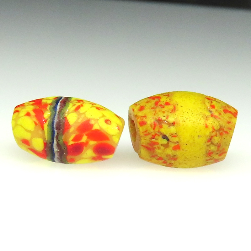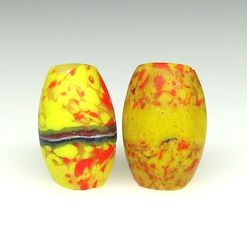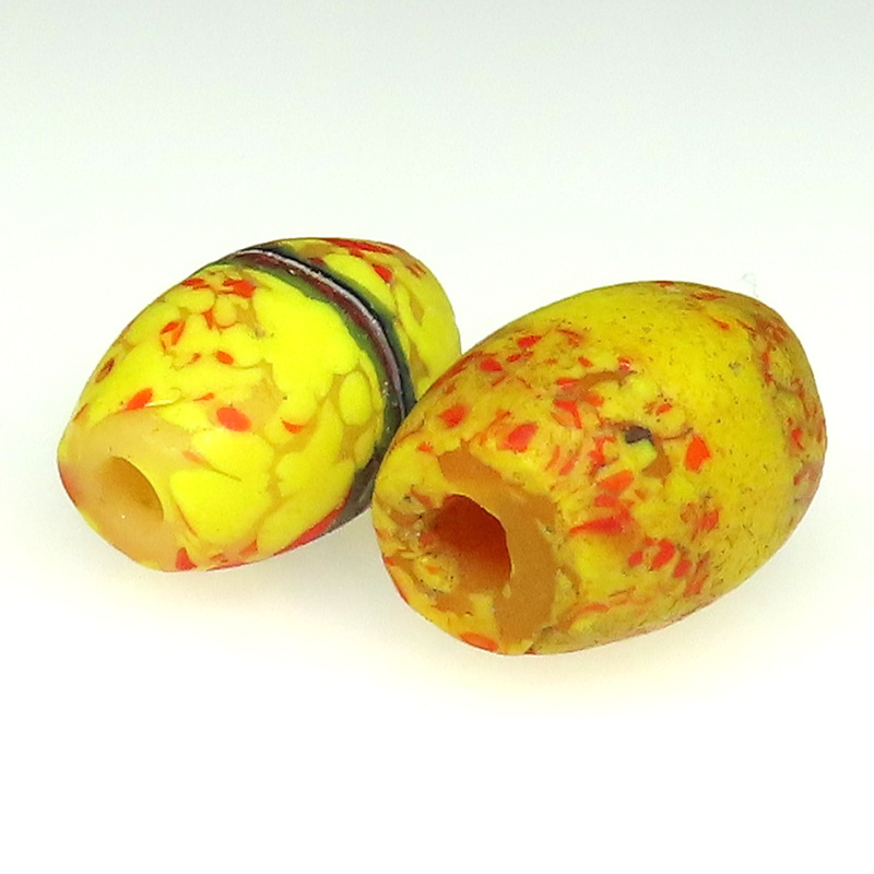 詳しくは、トンボ玉の名前コーナーの「エンドオブザデイ」をご覧ください。 https://www.pandamo.net/page/43 オーバル型の大変凝った作り。コアは、クリーム色。 2個セットです。 |